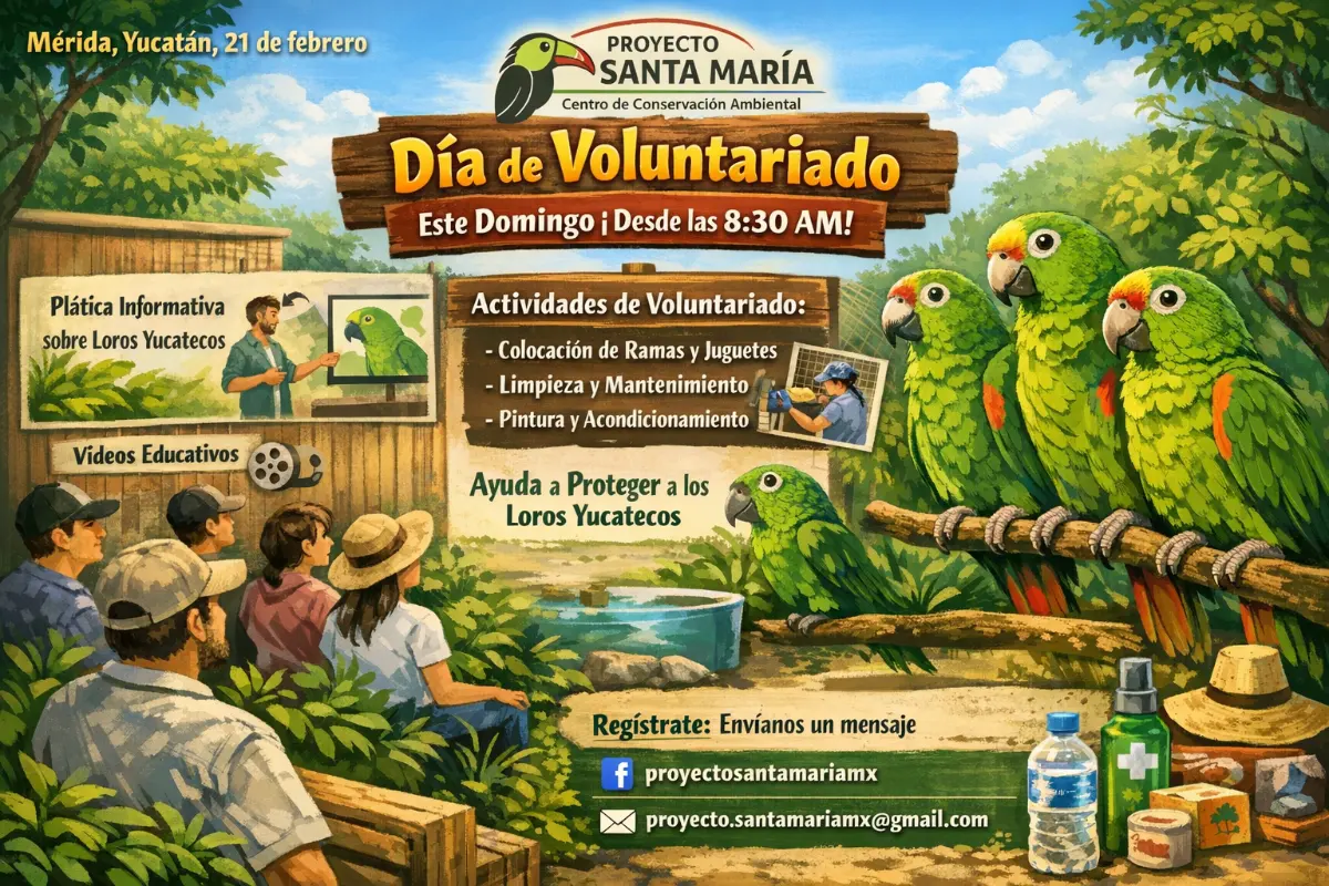 Mérida, Yucatán, 21 de febrero.— El Centro de Difusión y Conservación Ambiental Proyecto Santa María, que trabaja por la conservación de los loros yucatecos y su hábitat, invita este domingo a su Día de Voluntariado a partir de las 8:30 de la mañana.