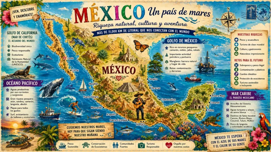 Hay países que viven de espaldas al mar. México no es uno de ellos, aunque a veces lo parezca. Con más de once mil kilómetros de litoral, el país está abrazado por aguas que no solo dibujan su geografía, sino que sostienen silenciosamente buena parte de su economía, su cultura y su identidad. Desde la rudeza del Pacífico hasta la transparencia del Caribe, pasando por la complejidad del Golfo y la exuberancia casi mítica del Golfo de California, México es, en los hechos, una nación marítima. Pero no siempre actúa como tal.