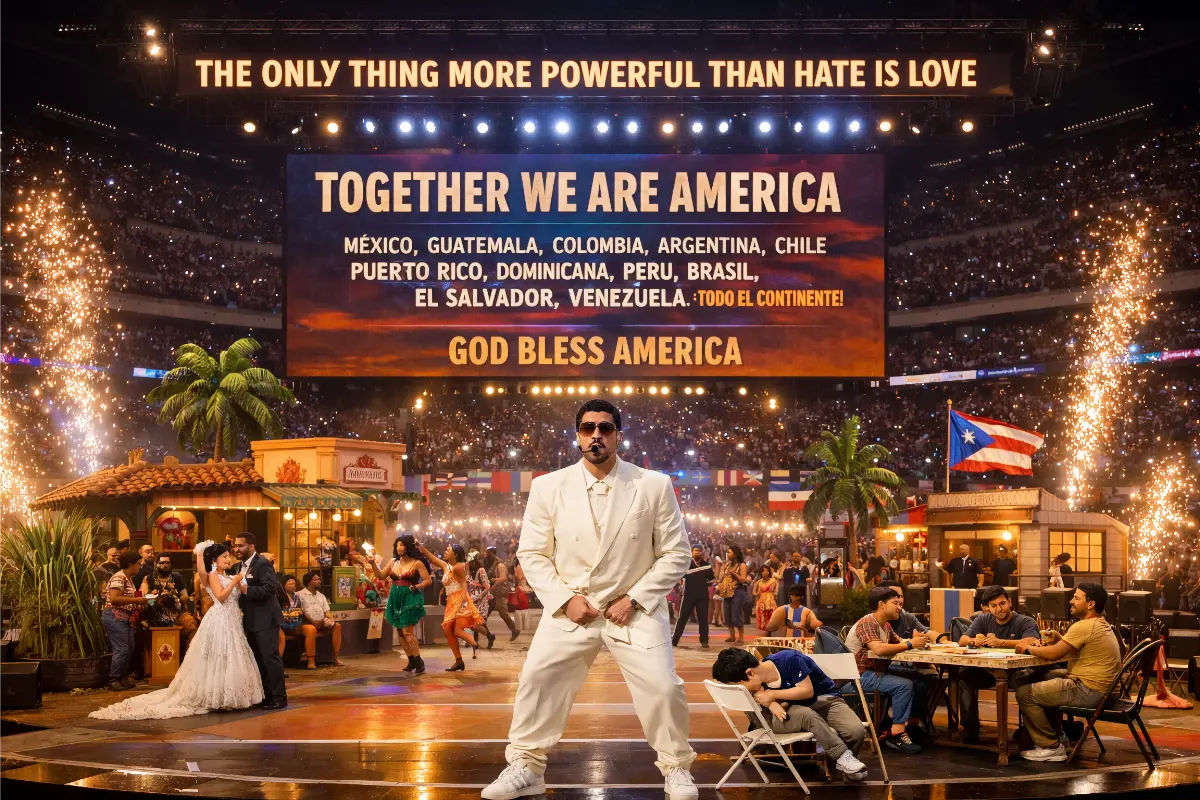 En el espectáculo de medio tiempo del Super Bowl LX, Bad Bunny utilizó su plataforma para transmitir mensajes de unidad continental, identidad latina y resistencia cultural. Su presentación estuvo cargada de simbolismo social. Al decir “God bless America” (Dios bendiga a América, en español), para después mencionar todos los países del Continente, con un mensaje claro: “Together We Are America”  “Juntos somos América”, desafió  el monopolio de la identidad continental.